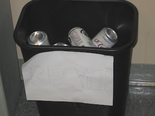 Recently, I noticed a very small trash can in the kitchen affixed with a piece of paper containing the hand-scrawled word "Recycle." When I first saw the can I was amused because there seemed to be no consensus as to what recyclables should be in the can. Aluminum cans, plastic bottles, and plastic wrappers all filled the can. At least now, no one is putting plastics in the can.